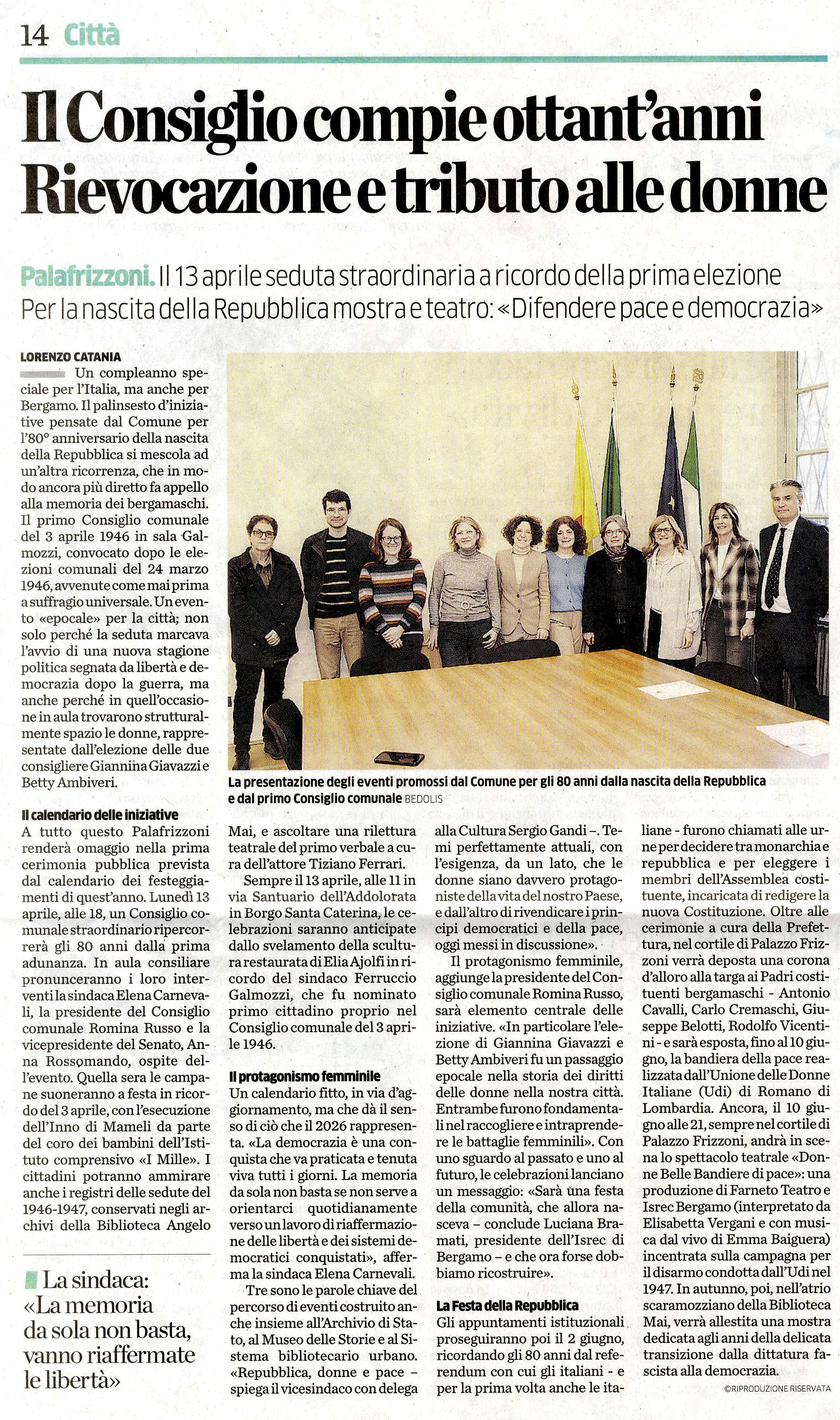 Il Consiglio compie ottant'anni. Rievocazione e tributo alle donne (di Lorenzo Catania, L'Eco di Bergamo, 3 aprile)